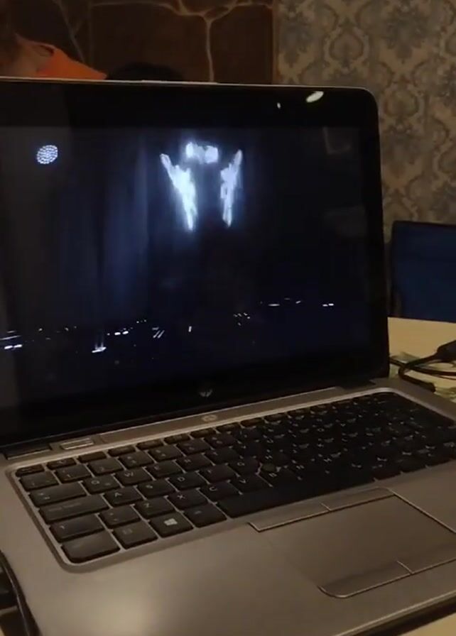 A laptop is on a table displaying a video of a DJ. A person is seated behind the laptop and partially visible in the upper left of the frame. The laptop is a silver HP model. The DJ in the video is female and wearing headphones while operating a mixing console. The background behind the DJ is dark and slightly blurred, with some bright light patterns. The table the laptop is on appears to be made of a light-colored material. The background of the room has a stone pattern on the left and a patterned wallpaper on the right. A blue chair is partially visible in the background. The camera angle is relatively high, looking down at the laptop.