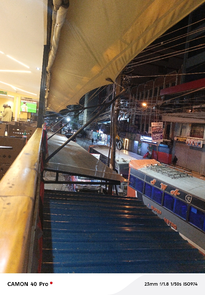 The image depicts an elevated night view of a bustling urban street scene in Nairobi, Kenya, observed from a commercial establishment. In the immediate foreground, a golden-yellow handrail runs horizontally, with a blue corrugated metal canopy extending below it, leading to the street level. Above this, a large tan fabric awning stretches diagonally from the top left. To the upper left, an interior space is visible, brightly illuminated by linear white and yellow lights. Two individuals, one in a light-colored uniform, stand near a television displaying a football match. Dark-brown booth seating is also present, suggesting a restaurant or cafe environment. Below the awnings, the street is dimly lit by streetlights and shop signs. Numerous overhead power lines and communication cables crisscross the sky. Several commercial buildings line the street, many with metal security shutters pulled down, indicating nighttime closure. Prominent signage includes a red "GoCare" logo, a partially visible "HOTEL" sign, and what appears to be "BANDARI STREET." Vehicular traffic includes a distinct grey and orange public transport bus with "SUPER METRO" and "S W A G" decals on its side, featuring dark blue windows. A white delivery truck is also discernible further down the street. Sparse pedestrian activity is observed, with isolated figures walking on the sidewalks. The overall environment is an active commercial district at night.