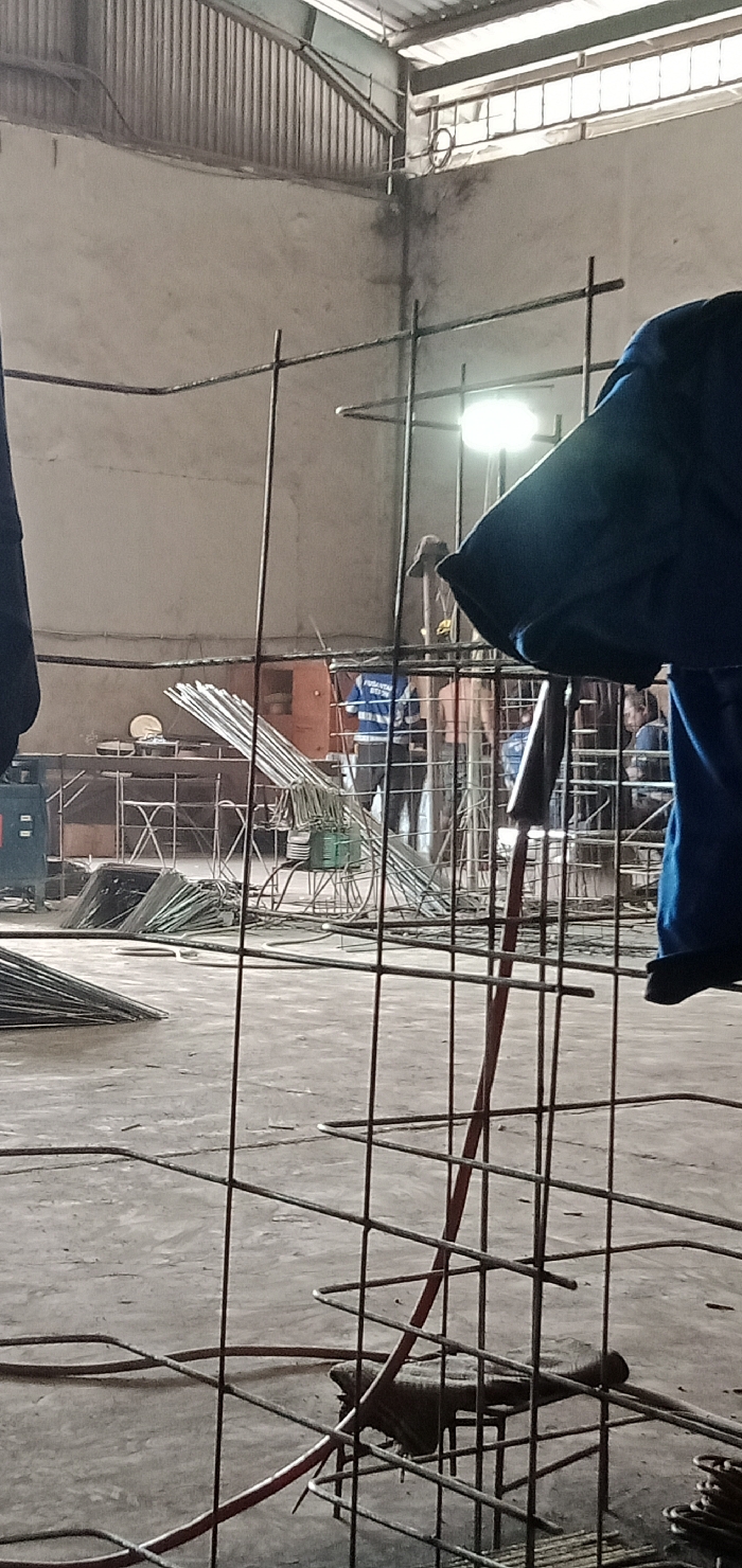 This image depicts an interior view of an industrial workshop or fabrication facility in Sumput, Indonesia. The scene is dominated by metal construction elements and equipment, suggesting ongoing metalworking or structural preparation. In the immediate foreground, a grid of dark metal rebar or reinforcing mesh extends across the lower and central portions of the frame. A red cable, consistent with a welding lead, extends diagonally from the upper right towards the lower center, terminating in a dark metallic object resembling an electrode holder, which is resting within the rebar grid. A dark, possibly fabric, object is draped over a rebar intersection in the lower right. Several individuals are visible in the midground and background. On the far right, a partial view of a person wearing a blue garment is present, with their right shoulder and arm prominently featured. Further back, near the center, a man wearing a blue shirt with white lettering (partially visible as "FUMENTECH" or similar) stands, facing left, partially obscured by the rebar. To his right and slightly behind, another man with a beard is visible, also wearing a light-colored shirt. Another figure, wearing a hat, is seen further back near a bright overhead work lamp, which emits a strong white light. The concrete floor shows various piles of metal materials, including stacks of bent rebar or metal rods, particularly on the left. A black welding machine with attached cables is visible on the far left. A rudimentary workbench or table, holding several circular metallic objects (possibly plates), is situated in the left background. The environment consists of light-colored concrete walls and a corrugated metal roof structure with visible support beams. Natural light appears to enter from overhead windows or openings near the roofline. Dark smudges or stains are present on the concrete wall in the upper right corner, indicating wear or residue. The overall lighting is a combination of natural and artificial sources, with the prominent work lamp providing strong illumination in the mid-background. No direct active interactions between individuals are depicted; the scene suggests a paused or observational moment within an active work environment.