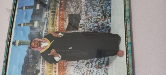 A framed composite photograph is affixed to a light pink, textured wall in Meknes, Morocco. The photograph depicts a barefoot, middle-aged man with a dark beard, wearing a black thobe, a white ghutra, and a black agal with a gold trim. He stands centrally, facing forward, with both hands raised in a supplicatory gesture; his left hand holds a string of dark prayer beads. The man is superimposed onto a background image of the Masjid al-Haram in Mecca, Saudi Arabia. This background includes the Kaaba, located in the lower right, surrounded by a densely packed crowd of pilgrims performing circumambulation (Tawaf). Multiple minarets and various multi-story buildings of the mosque complex are visible under a clear blue sky, with a mountainous cityscape in the distant background on the left. The photograph is encased in a decorative frame featuring a narrow gold inner border and a wider outer section with a marbled pattern in shades of green and blue.