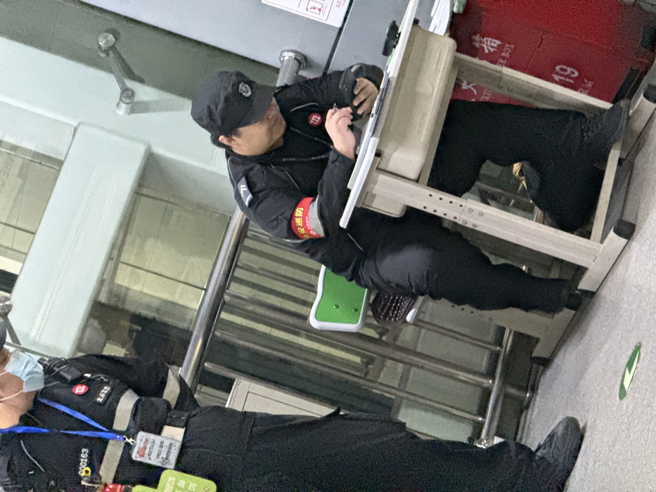 Two people wearing uniforms are in the scene. One individual is sitting at a desk with a pen in their hand. They are wearing a black cap and have a red armband. Their feet are resting on the lower part of the desk. Beside them, another person is standing, also in a uniform, wearing a mask and a name tag. Both are likely security personnel. A red box with the number 19 is visible near the top of the image.