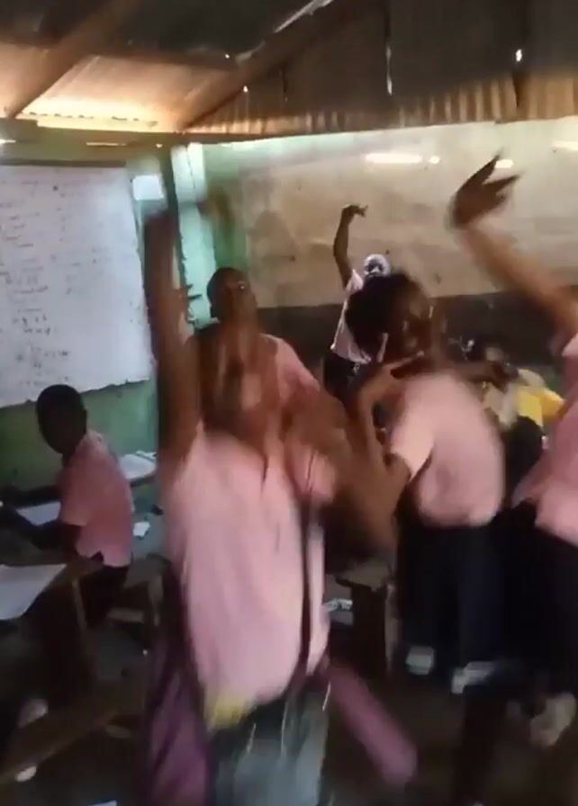 Inside a classroom, a group of school children in pink polo shirts and various pants and skirts are seen dancing and celebrating. The classroom has desks and a whiteboard filled with writing. The ceiling is corrugated metal. The children are very excited and some are raising their arms in the air. The overall atmosphere is joyous.