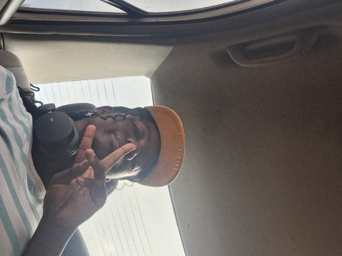 A single individual is seated inside a vehicle in Itirin, Nigeria, visible from the chest upwards. The person has dark skin, dark hair styled in braids or dreadlocks, and wears a mustard yellow flat-brimmed cap. A pair of black over-ear headphones rests around their neck. They are wearing a light blue and white striped t-shirt. A silver-colored cross earring is visible on the left ear, and a star-shaped earring is visible on the right ear. The individual is looking directly at the camera with a slight smile and holds their right hand up, forming a "V" gesture with the index and middle fingers. The vehicle's interior features a light grey or beige ceiling and a visible grab handle on the upper left. A window is partially visible behind the individual, showing an indistinct, bright outdoor background.
