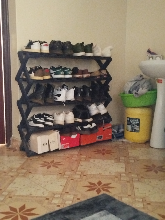 black shoe rack with four shelves, filled with a variety of shoes. The rack is located in a room with tiled flooring, and there is a white porcelain sink and a yellow container labeled "Golden Drop" to the right of the rack. The room is likely an entryway or a hallway, and the shoe rack is placed against a light-colored wall. The floor has a beige and brown tiled pattern.