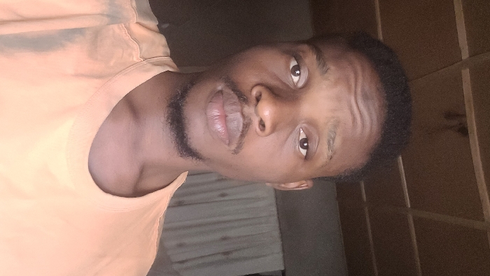A dark-skinned adult male is depicted in a close-up, head-and-shoulders portrait within an indoor setting in Badiko, Nigeria