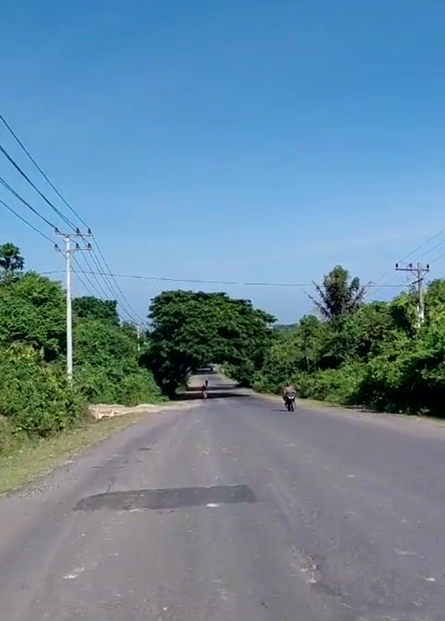 road leading into the distance, flanked by lush green trees and vegetation. The road is mostly grey, with some dark patches. Power lines run above the road, supported by utility poles on either side. In the distance, a person appears to be walking along the road while another person rides a motorcycle. The sky above is clear and blue. The camera appears to be moving forward along the road.