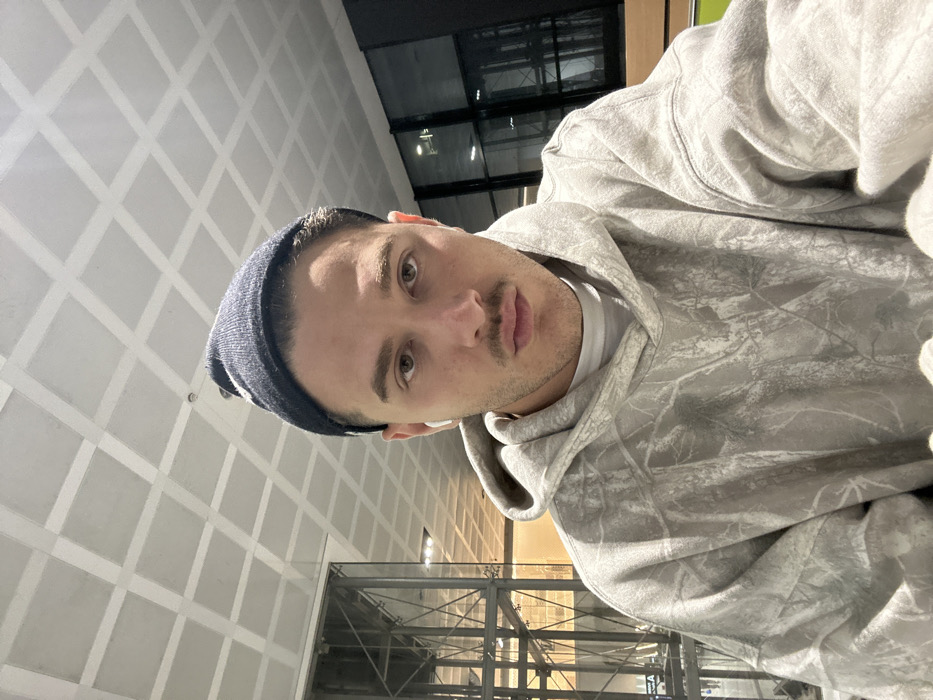 An adult male is depicted in a headshot-style image, positioned indoors, likely within Milan Malpensa Airport in Ferno, Italy. The subject has short dark hair, a light mustache, and stubble, and maintains direct eye contact with the camera. He wears a dark blue knit beanie pulled low on his forehead and a light grey hooded sweatshirt featuring a white, abstract, or camouflage-like pattern. A white crew-neck t-shirt collar is visible beneath the hoodie, and a white wireless earbud is present in his left ear. The background consists of a light-colored grid ceiling with embedded lighting fixtures in the upper portion of the frame. To the subject's left, a large, multi-story glass and metal architectural structure is partially visible, with a white sign containing the letter "A" and an arrow just discernible at its base. To the right, the background is darker, showing reflections and distant artificial light sources.