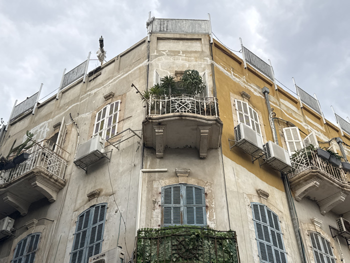 An aged building’s corner shows a mix of architectural styles and wear. The left side is light gray, while the right is yellow. Balconies with ornate railings hold plants. Windows with shutters are a recurring feature, some open, some closed. Air conditioning units are attached below some windows. The building’s top has a simple railing and some sort of structure, possibly related to antennas or utility equipment. Cracks and peeling paint are visible, indicating the building’s age. The sky is overcast.