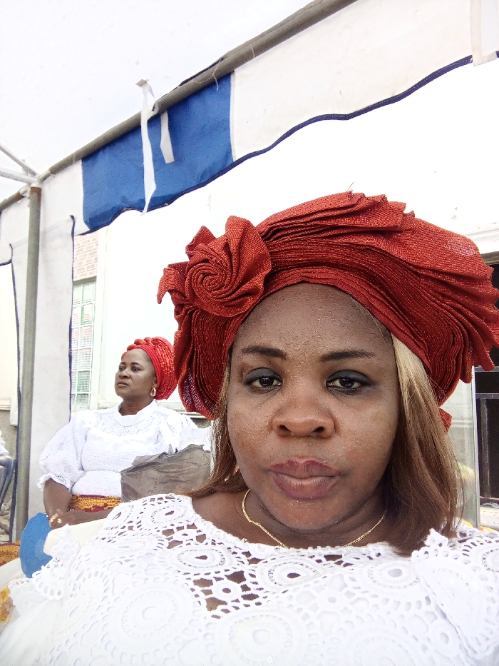 two adult females situated beneath a white and blue striped event canopy supported by gray metal framework. The primary subject, in the foreground, directly faces the camera. She has dark skin, dark eye makeup, and light brown hair highlights visible beneath a large, elaborate reddish-brown headwrap (gele) featuring a prominent layered floral design. She wears a white lace top with a geometric circular pattern and a thin gold chain. Her lips are slightly pursed. A second adult female is visible in the background, seated to the left, wearing a red headwrap, gold hoop earrings, and a white lace top with puff sleeves. This individual is gazing to her left, away from the camera. A dark, crumpled object rests between the two subjects. Behind them, a blurred light-colored building with a barred window is partially visible. The attire suggests a formal or celebratory gathering, culturally consistent with Nigeria. The specific location within Lagos, Nigeria, is not identifiable from the visual evidence.