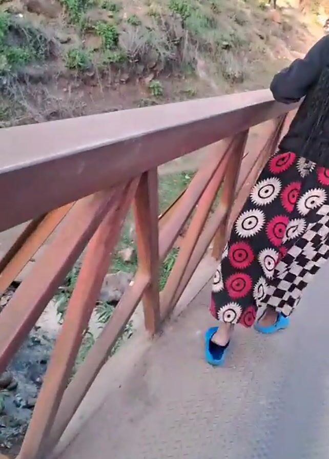 A person walks across a bridge with wooden railings. The person has long, dark hair and wears a black jacket and a long, patterned skirt with blue sandals. The bridge appears to be made of metal and spans a small, overgrown gully. Lush greenery and trees surround the area, and houses can be seen in the background. The sky is partly cloudy, suggesting it might be early morning or late afternoon.