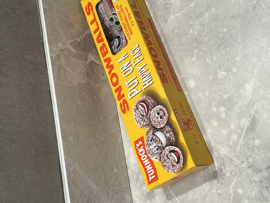A yellow box of Tunnock's Snowballs is displayed diagonally on a grey and white tiled surface