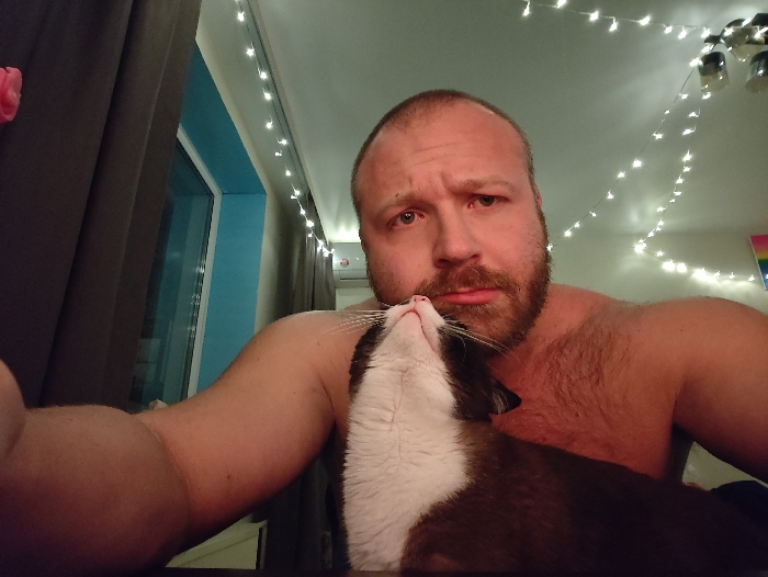 - "A shirtless, fair-skinned man with a reddish beard and worried expression poses for a selfie with a tuxedo cat" by FM-eMutn2, licensed under CC BY 4.0