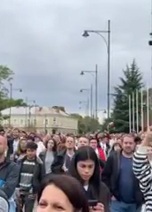 The video captures a crowd of people standing on a street, seemingly gathered for a demonstration or rally