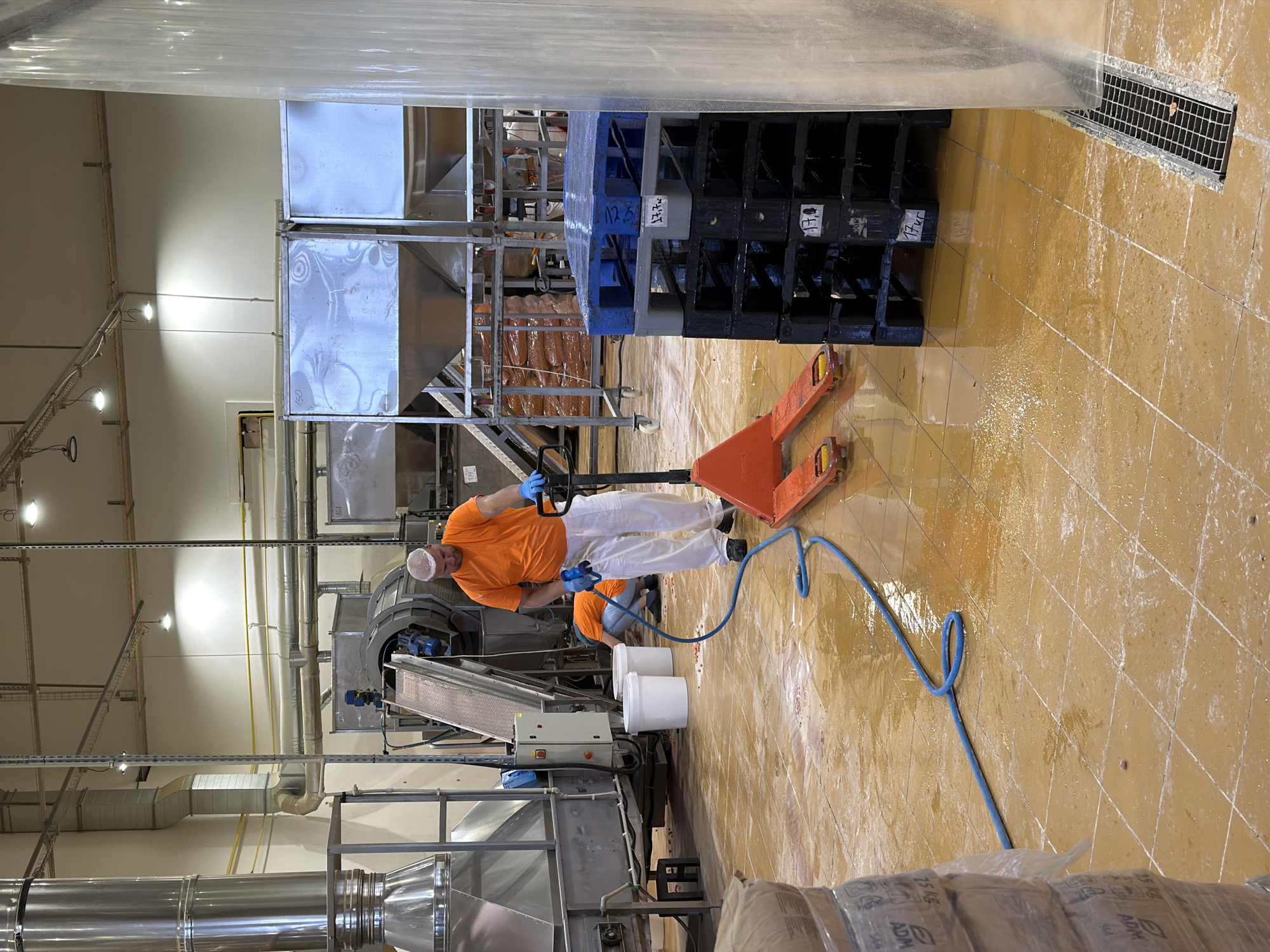 The image depicts an indoor industrial environment, possibly a food processing facility in Lozen, Bulgaria. The floor is a yellow-brown tiled surface with apparent moisture. Two individuals wearing personal protective equipment (PPE), including orange shirts, white pants, blue gloves, and head coverings, are present. One individual is operating an orange pallet jack, which is carrying stacked black and blue plastic pallets. A blue hose is lying on the floor. In the background, stainless steel processing equipment is visible, including ductwork and a conveyor belt. The pallets appear to be stacked near a drainage grate. Bags of product are visible near the bottom of the frame.