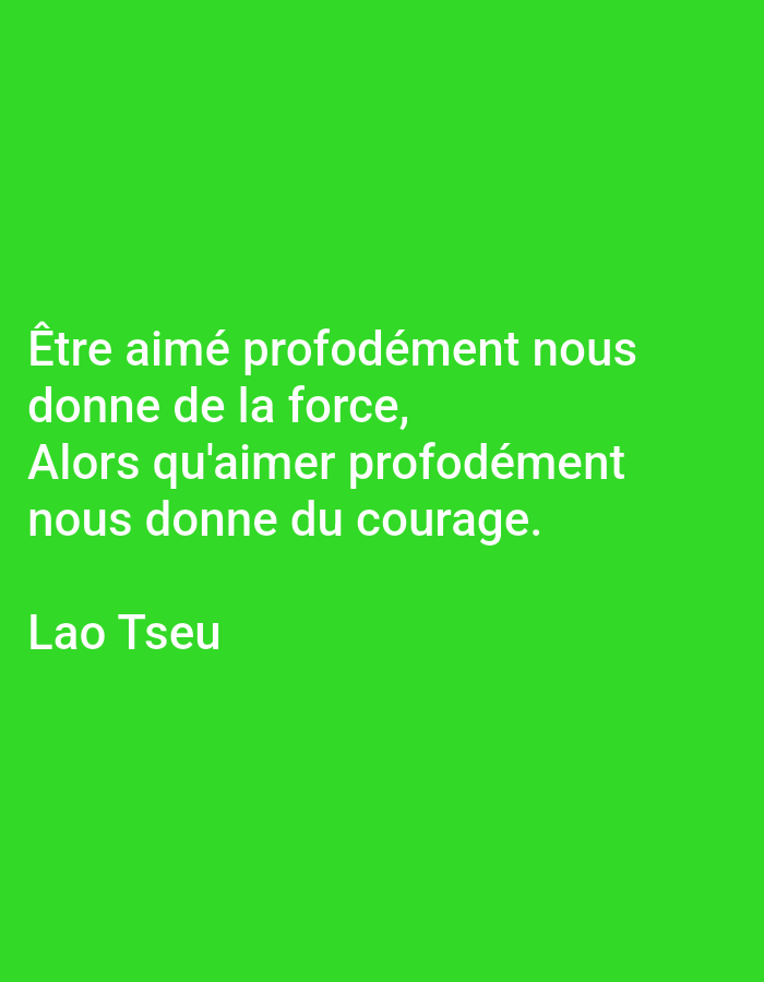 The image is a quote by Lao Tse, written in white against a solid green background. The quote reads, "Être aimé profondément nous donne de la force, Alors qu'aimer profondément nous donne du courage." It is a quote about the power of love and its ability to provide strength and courage. The location is Illkirch-Graffenstaden, France. The coordinates are 48.523 latitude and 7.719 longitude. The environment is a simple green background with white text. The scene is static with no people, objects, or actions.