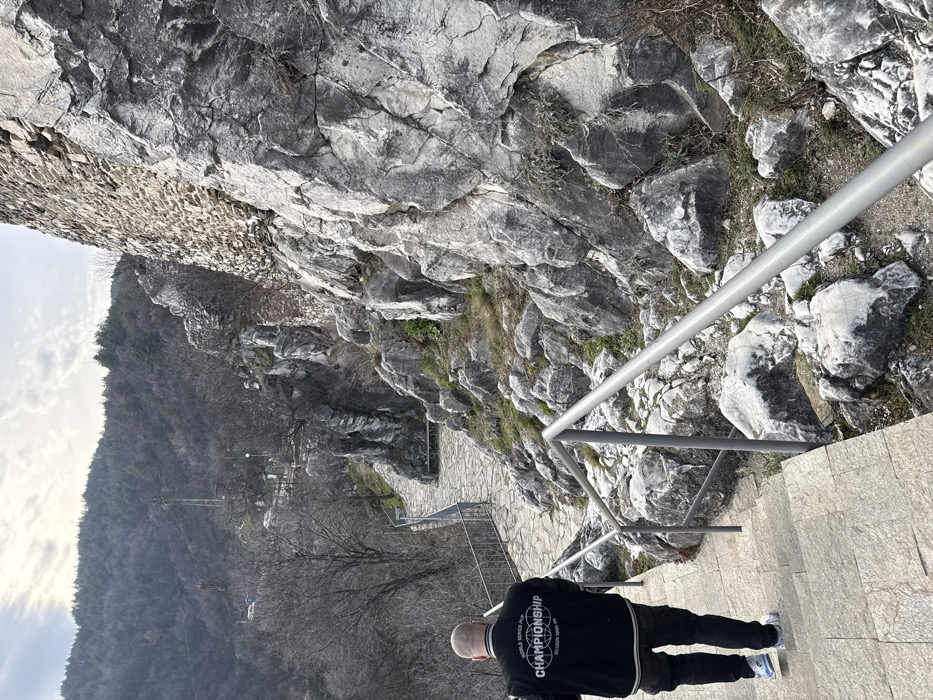 A male individual is observed from behind, descending stone steps outdoors. He wears a black bomber jacket with "WORLD SERIES OF POP CHAMPIONSHIP SEASON 1995-96" prominently displayed on the back, black trousers, and light-colored sneakers. The steps are equipped with grey metal handrails on both sides. To the right of the steps, a steep rocky hillside rises, composed of large grey boulders interspersed with sparse vegetation. An ancient stone wall, likely part of Asen's Fortress, is visible on the upper right section of this rock face. Beyond the descending steps, a winding paved pathway is visible, edged by a metal railing on its left side, leading further into a valley. This pathway features a wooden bench at one point. In the middle distance, along the path, several parked vehicles, light poles, and a tall transmission tower or similar mast are discernible. The background consists of densely forested mountains under an overcast sky. The scene depicts a section of the historical and natural landscape surrounding the city of Asenovgrad, Bulgaria.
