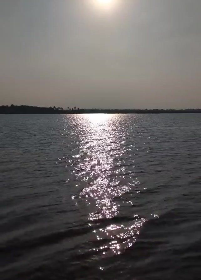 body of water reflecting sunlight. The sun is visible in the sky, and its reflection creates a bright, shimmering path across the water's surface. The water appears slightly choppy with gentle ripples. In the distance, a dark strip of land is visible on the horizon.
