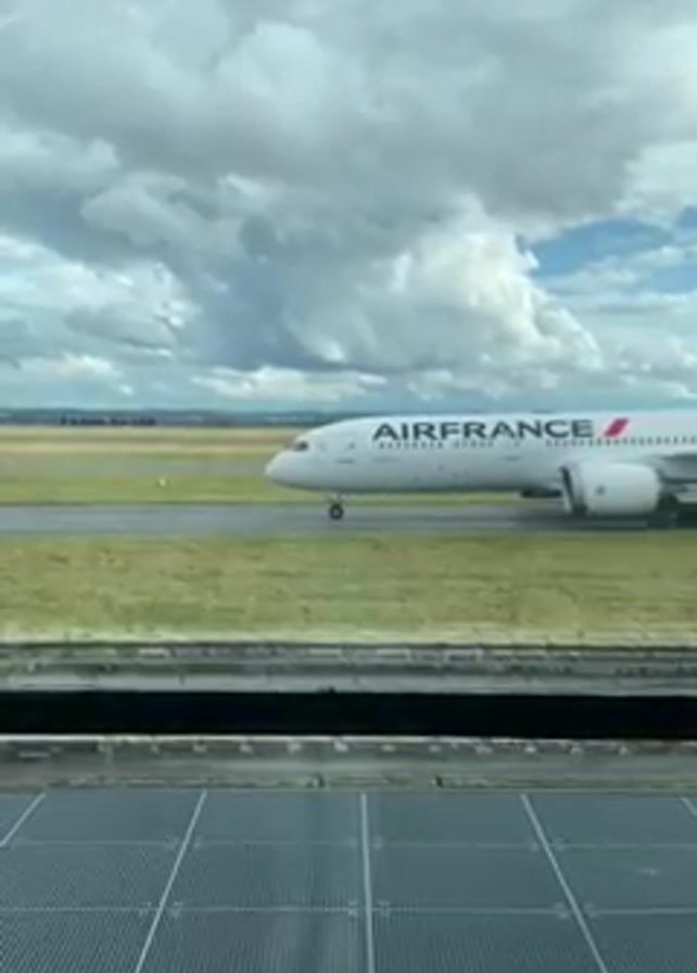 From behind a window, a static shot shows an Air France airplane on the tarmac
