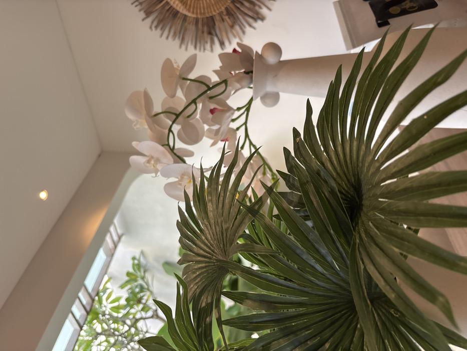 The scene is located in Kerobokan, Indonesia, depicting an interior space with an outward view. In the immediate foreground, dark green, fanned palm-like leaves partially obscure the lower portion of the frame. To the right of the foreground foliage, a tall, white, matte ceramic vase with two spherical protrusions on its upper section holds multiple artificial white orchid blooms featuring subtle pink centers. The upper left background reveals an outdoor area through an opening, showing light green tree foliage against a light-colored wall. The white ceiling above contains a single recessed downlight. On the far right, a portion of a circular, light-brown, spoked wall hanging is visible, along with the top section of a white package or container below it. No persons are present. No actions or interactions are depicted.
