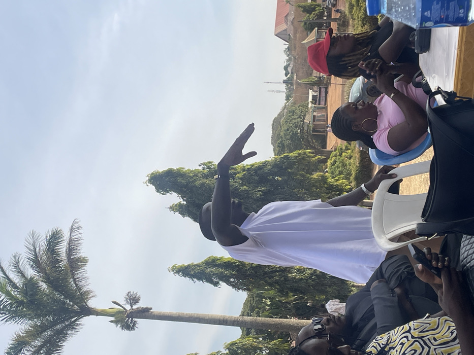 An outdoor scene in Jos, Nigeria, depicts a daytime gathering of individuals under a clear sky with scattered clouds
