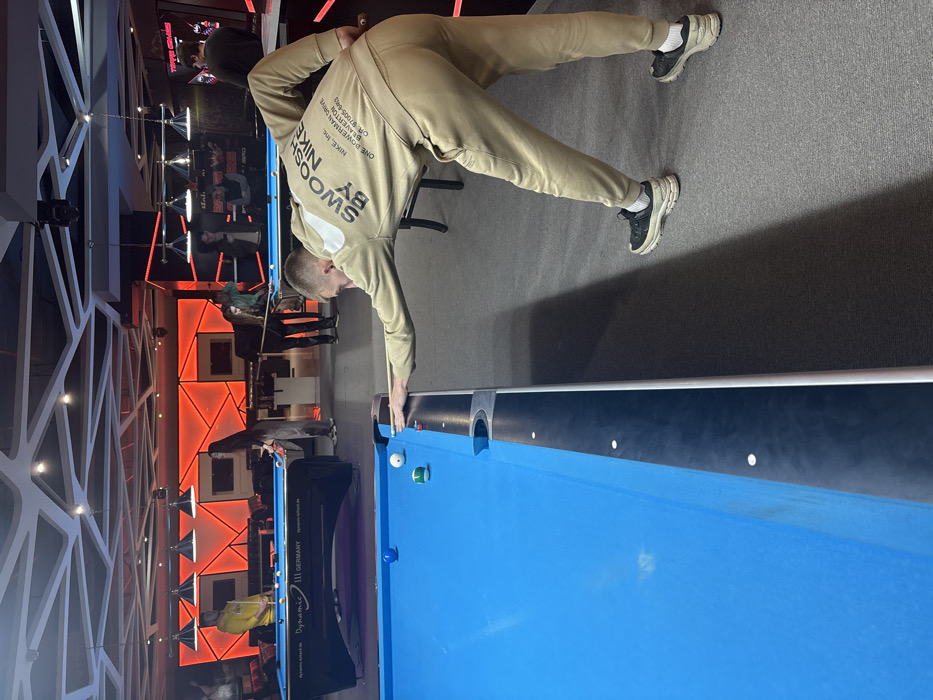 The image displays an interior view of the Topo Gaming Club in Gabrovo, Bulgaria, a billiards and gaming establishment. In the foreground, a male individual, appearing to be a young adult, with short, light-colored hair, is positioned over a bright blue-felt pool table. He wears a light beige hooded tracksuit, with "SWOOSH NIKE" and the Nike corporate address printed in white on the back of the hoodie. His right hand holds a pool cue, extended forward, with his left hand forming a bridge as he lines up a shot. The cue ball, a green-striped ball, and a blue solid ball are visible on the table near a corner pocket. He is wearing dark sneakers with thick, light-colored soles. In the mid-ground, to the left, a male individual in a yellow long-sleeved shirt stands by a second blue-felt pool table, holding a cue. A female in light-colored attire is also standing near this table. Further to the right, a second female, dressed in dark clothing, is actively leaning over a third blue pool table, preparing to take a shot with her cue. Another male in a light green shirt stands beside her. Additional individuals are discernible in the background, observing or engaged in play. The facility features multiple blue-felt pool tables, with one table in the mid-ground visibly branded "Dynamic III GERMANY." The walls are composed of dark panels accented with prominent red geometric backlighting and integrated screens. The ceiling has a decorative geometric pattern with track lighting and recessed fixtures, illuminating the space. The floor is covered with a dark grey carpet. Signs, including "TOPO GAMING" and "BIZNES BRO," are visible on the back walls, confirming the club's identity.