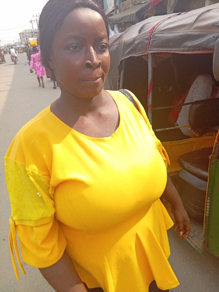 A woman in a yellow top with lace sleeves stands near a parked auto rickshaw on a street. Other pedestrians are walking in the background. The woman has dark hair and appears to be looking slightly to the right. The rickshaw is partially visible, showing its passenger seat. The scene suggests an urban environment during daylight.