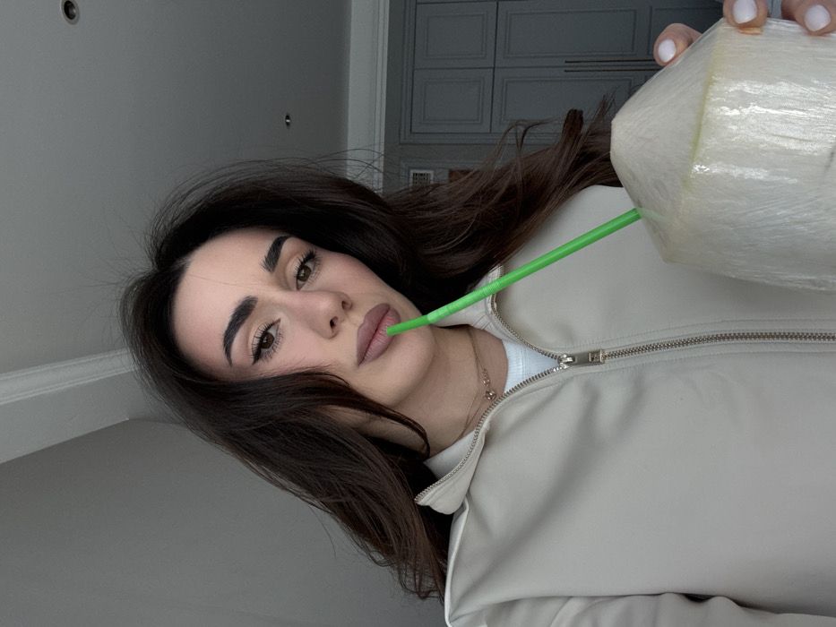 A female individual is depicted in a close-up, waist-up portrait, located indoors in Yiwu, China. She has dark brown, wavy hair and fair skin, with visible makeup including winged eyeliner, filled eyebrows, and light pink lipstick. She wears a light beige zippered jacket over a white top, accessorized with two delicate gold necklaces. Her gaze is directed towards the camera. She is actively drinking from a fresh, light-colored coconut, which is partially encased in clear plastic film, utilizing a bright green plastic straw. Her left hand, featuring manicured nails with light-colored polish, holds the coconut. The indoor background includes a light-colored ceiling with crown molding on the left and dark grey paneled cabinets or furniture on the right.
