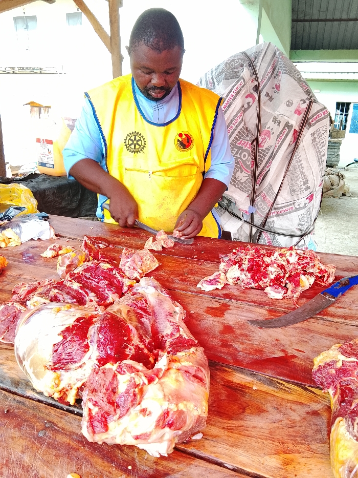A man in a yellow Rotary Club vest cuts raw meat on a wooden table. The meat appears to be beef, with significant portions of fat. Another large piece of meat sits on the table to his left, with piles of cut meat beside him and to his right. Behind him are large cement bags covered in packaging. The setting appears to be outdoors, under a shelter.