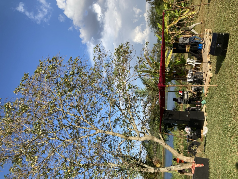 The image displays an outdoor music event setup located in Murera ward, Kenya, positioned on a grassy lawn adjacent to a body of water