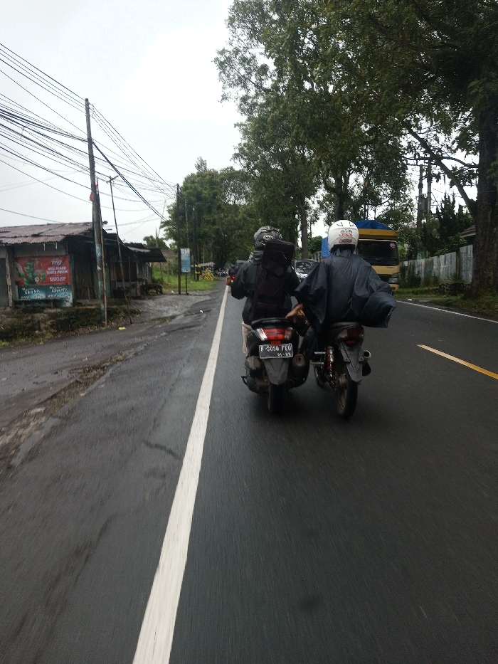 The image depicts an outdoor scene from a slightly elevated perspective, looking forward on a wet, two-lane asphalt road under an overcast sky. Two individuals are riding motorcycles in the foreground, moving away from the viewer. The person on the left is on a dark-colored scooter, specifically a model resembling a Yamaha NMAX, with a rear license plate displaying "F 5050 FEU" and "01-23" below. This rider wears a grey full-face helmet, a dark jacket, and carries a black backpack. The person on the right is on a lighter-colored motorcycle, likely an underbone type, and wears a white full-face helmet and a dark, billowy rain poncho or jacket. To the left of the road, a dirt shoulder parallels the asphalt. Beyond it, a row of dilapidated, single-story structures with corrugated metal roofs are visible, appearing to be small shops or stalls. A prominent red and white sign on one structure partially displays Indonesian text including "JUAL PULSA" (Sell Credit) and "INDOSAT." A wooden utility pole stands in front of these structures, densely covered with numerous black electrical or communication wires. The ground near the structures is unpaved and wet. To the right of the road, dense green trees line the roadside, continuing into the mid-ground. A light-colored fence or wall is partially visible beneath the trees. In the distance, a yellow and blue truck is visible on the road, also moving away from the camera's perspective. The sky is a uniform bright grey, indicative of heavy cloud cover. Regarding the requested location, the scene is described as being in Serpang Shalli, Bhutan. However, visual evidence from the image, specifically the "F 5050 FEU" license plate and the Indonesian text "JUAL PULSA" on a roadside sign, strongly indicates the location is in Indonesia, not Bhutan.