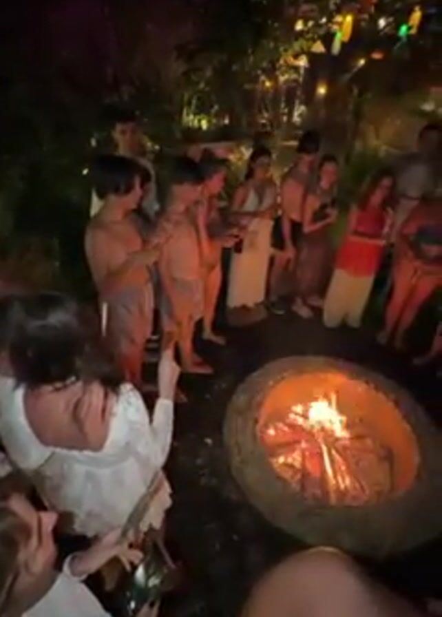 A group of about 20 people are standing in a circle around a lit fire pit at night. Most of the people are wearing white clothing, while some are wearing brightly colored clothing. The area around the fire pit is dark, and trees and other plants are visible in the background. There are colored lights hanging from the trees. Some people are holding candles or phones. One person is speaking while others are listening. The scene appears to be a ritualistic gathering or ceremony.
