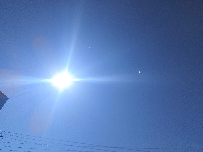 The image displays a clear blue daytime sky over Mansehra, Pakistan. A brilliant, star-shaped light source, consistent with the sun, is prominent in the upper-left quadrant, producing significant lens flare. A distinct, smaller white circular object is visible against the blue sky in the upper-right quadrant. The lower-left portion of the frame shows a dark, angular fragment of a structure, possibly a building or utility pole. Multiple parallel wires, indicative of electrical or communication lines, stretch horizontally across the bottom of the image. No people or observable actions are present.
