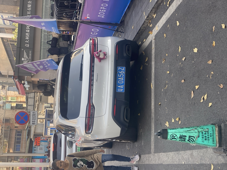 A white Porsche Macan is parked on a street, with a pink stuffed animal attached to the rear. The car's license plate reads "A·0A56Z". In the background, banners are displayed, and a store sign indicates "Italian Disen A G AMARNY". A woman wearing a Mickey Mouse sweater is partially visible at the bottom of the frame. A parking sign in Chinese is near the car, alongside fallen leaves on the street. There's also a damaged parking marker with Chinese characters.