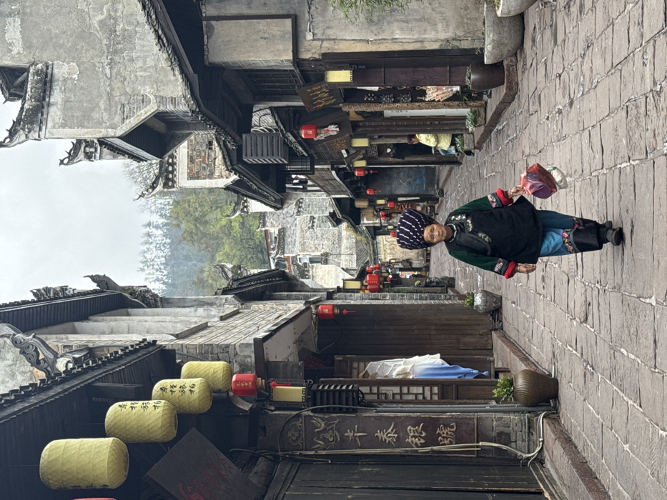 The image depicts a narrow, stone-paved street in the city of Fenghuang, China, lined with traditional, multi-story buildings under an overcast sky. In the foreground, an elderly individual, likely female, walks directly towards the viewer. This person is dressed in traditional attire, featuring a distinctive black and white striped, conical headpiece, a dark green and black tunic with red cuffs, blue pants with patterned lower leg cuffs, and dark shoes. They carry a multicolored bag (red, white, and purple) in their right hand. The buildings on both sides of the street exhibit traditional Chinese architecture with weathered facades, dark wooden elements, and tiled roofs featuring decorative eaves. Along the left side of the street, multiple yellow cylindrical lanterns hang above a doorway, which also features a vertical wooden sign with Chinese characters. Red rectangular lanterns are interspersed among the storefronts. A glimpse into one shop reveals white and blue fabric displayed. Potted plants are visible near some entrances. On the right side, similar architecture and lanterns are present. Further down the street, two other individuals are visible: one person in a yellow jacket is seated outside a shop, and another is partially obscured deeper within the alley. The street itself is paved with rectangular stone blocks. In the distance, beyond the buildings at the street's end, green hills covered with trees are visible under the cloudy sky.