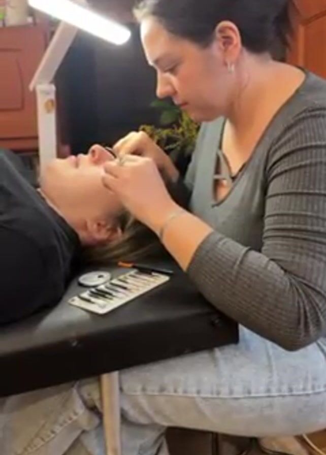 A woman in a gray shirt and light blue jeans is applying eyelash extensions to a woman lying down on a black cushion