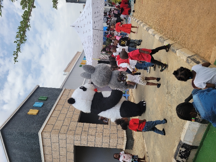 This image captures an outdoor event in Jos, Nigeria, primarily featuring children and two costumed characters. In the center, a large black and white panda mascot with a red collar stands facing a grey rabbit mascot on a light-colored paved surface. Numerous children, ranging in age, surround these mascots; some are observing, while others are walking. For example, a child in a red t-shirt and blue jeans stands near the panda, and another child in a red shirt walks towards the right of the frame. In the foreground, two children are seated on a green artificial turf next to a black and white striped curb, with a sandy area stretching beyond. The background on the left features a two-story building with a light-colored stone-effect lower facade and a dark grey upper section adorned with three distinct colored rectangular panels (yellow, light blue, green). A person is partially visible inside a ground-level opening of this building. To the right, a large white, pointed canopy or tent covers an area where more children and adults are gathered, some seated. Beyond the tent, lighter-colored buildings are visible under a cloudy sky, with green tree foliage in the upper right.