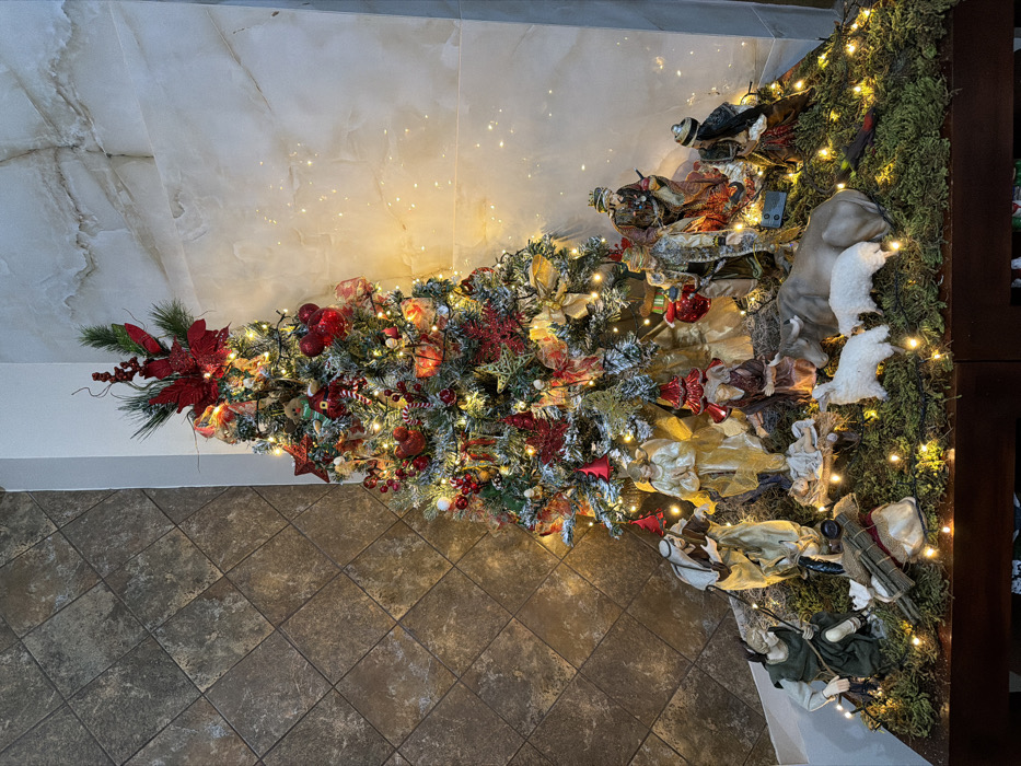 An overhead shot displays a decorated Christmas tree illuminated with warm lights and adorned with red and gold ornaments. The tree sits next to a textured tile floor and a marble-like wall. To the right, a nativity scene with figurines and faux moss adds to the festive decor. The overall ambiance is warm and inviting, suggesting a carefully curated holiday setting.