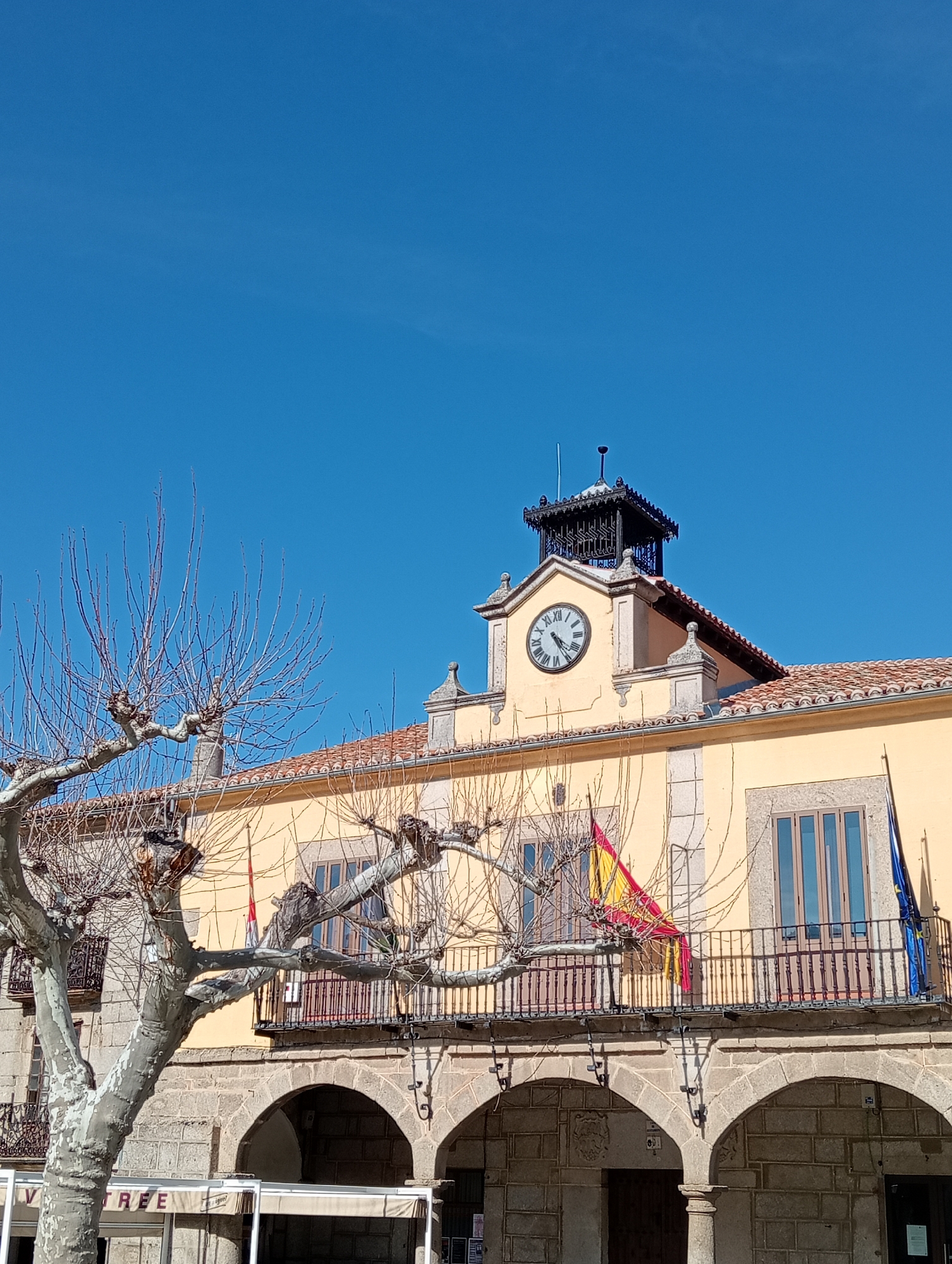 The image depicts the Ayuntamiento (Town Hall) building in Piedrahíta, Spain, under a clear blue sky on a sunny day. The multi-story structure features a pale yellow facade with a red-tiled roof. A central clock tower rises above the roofline, displaying a white clock face with black Roman numerals indicating approximately 10:55. Above the clock is an ornate, dark-colored, open belfry or lantern structure with a pointed finial. Below the clock tower, a long balcony with a black wrought-iron railing spans the upper floor. Two flags are draped over this railing: the Spanish national flag (red, yellow, red horizontal stripes) on the left, and the European Union flag (blue with a circle of twelve yellow stars) on the right. The ground floor of the building features a series of stone arches forming a portico, with the base of stone columns visible. Hints of commercial establishments, including a white awning, are present beneath the arches on the left side. In the left foreground, a large, leafless deciduous tree with mottled grey and white bark and numerous bare branches partially obscures the building. No people are visible in the scene.