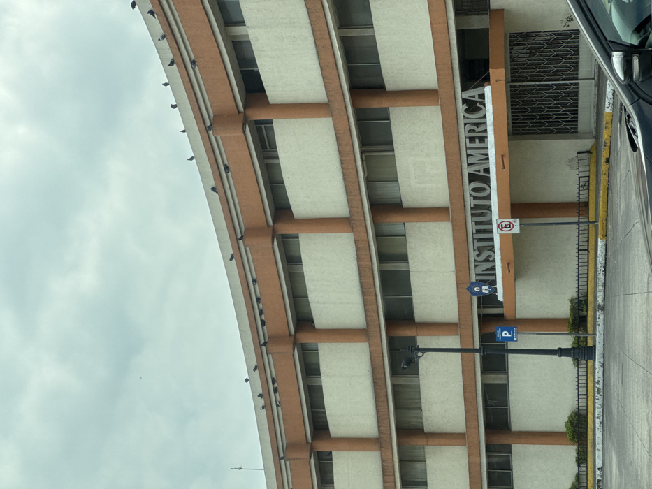 multi-story building with beige and brown exterior details. The building has numerous windows, with an overhang across the top where several birds are perched. A sign reads "INSTITUTO AMERICA" vertically on the side. A parking sign is visible. A car is partially visible in the right corner of the image. The sky appears overcast.