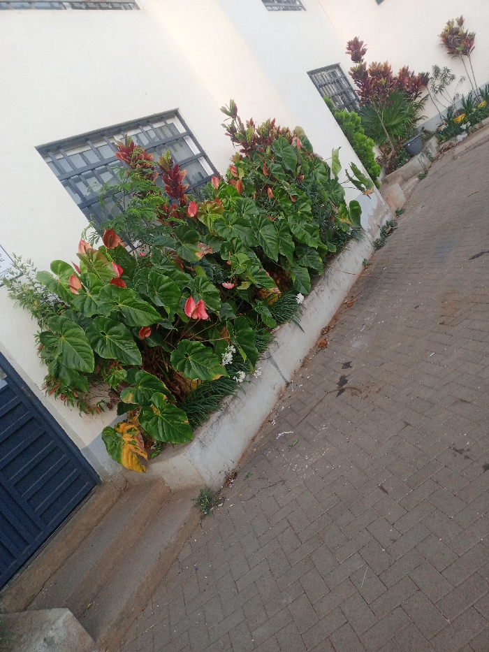 A low-angle shot reveals a building's exterior with dark-framed windows. A concrete planter filled with lush greenery, including large green leaves, red Anthurium flowers, and white blossoms, lines the base of the building. The planter runs along the building's edge and transitions into a paved walkway made of gray bricks. The walkway has some discoloration and debris. The building's wall is painted a light cream color.