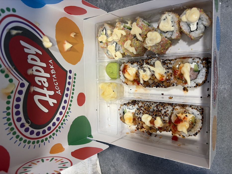 An open white cardboard delivery box, featuring a red heart with "Happy ДОСТАВКА" (Happy Delivery) branding, rests on a matte gray surface. Within the box, a clear plastic insert contains twenty-five individual sushi rolls divided into three rows. The left and middle rows each consist of eight sushi rolls, characterized by dark external garnishes, and topped with dollops of light-colored creamy sauce and a reddish-orange drizzle. The right row contains nine sushi rolls, distinguished by a lighter, possibly textured or fried exterior, and topped with the same light-colored creamy sauce. Adjacent to the sushi, two small clear compartments hold a mound of pale yellow pickled ginger and a dollop of bright green wasabi paste. Several small smears of the light-colored creamy sauce are present on the inside of the box lid. The specific location within the city of Unknown, Unknown, is unidentified, but the scene appears to be indoors on a flat surface, likely a table or countertop. No individuals are present in the image.