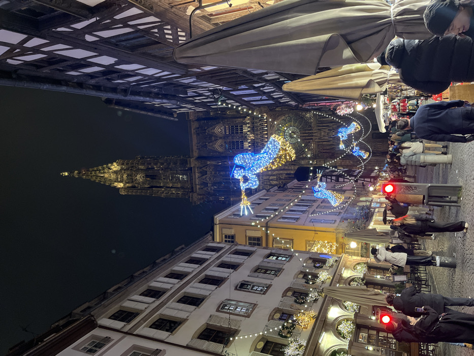 At night, a street scene depicts a tall cathedral looming in the distance, adorned with ornate details and illuminated by warm lights. Christmas decorations, including lighted angel figures, are strung across the street, adding to the festive atmosphere. People stroll along the pavement, some standing beneath the shade of open umbrellas, while buildings with rows of windows line the sides of the street, decorated with festive lights. A traffic light glows red, signaling a pause in the flow of movement.