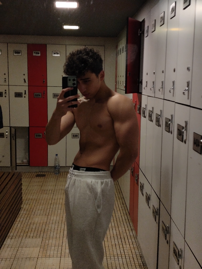 A shirtless man with curly hair is posing in front of lockers. He's holding a phone up, presumably taking a photo of himself. He's wearing grey sweatpants. The lockers are red and white. The setting appears to be a locker room, evidenced by the lockers and tile floor. A water bottle stands on the floor by the wall behind him.