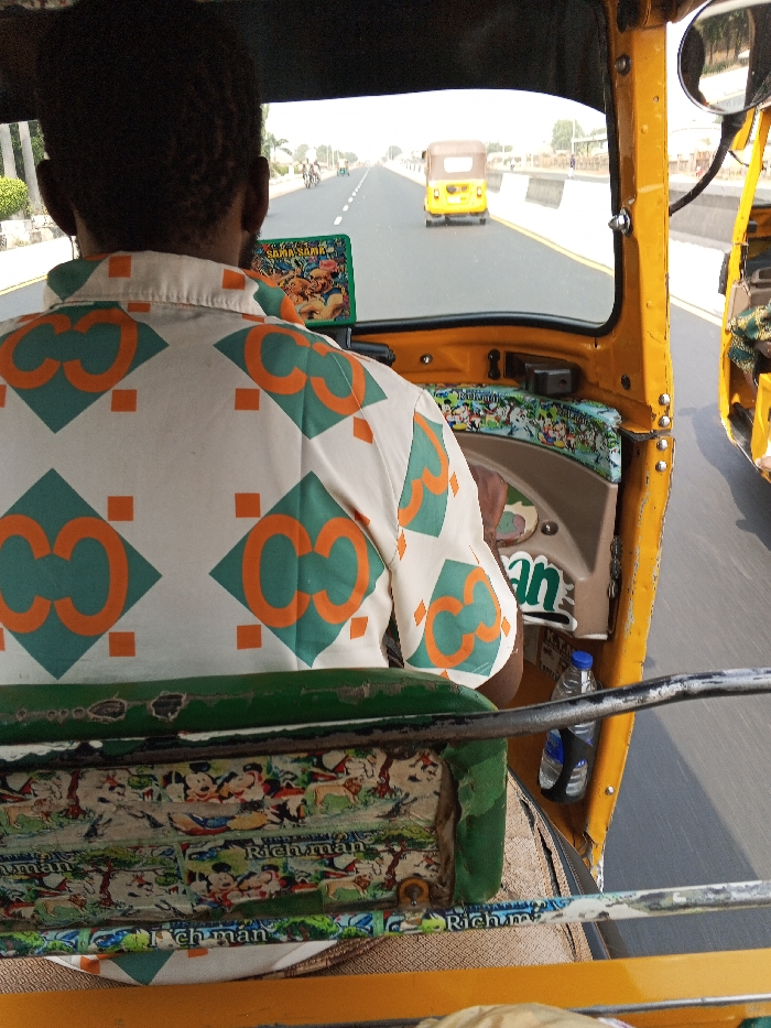 - "The image depicts a forward-facing perspective from inside a moving yellow three-wheeled vehicle (Keke Napep) in Gora, Nigeria" by FM-Rxlpl1, licensed under CC BY 4.0