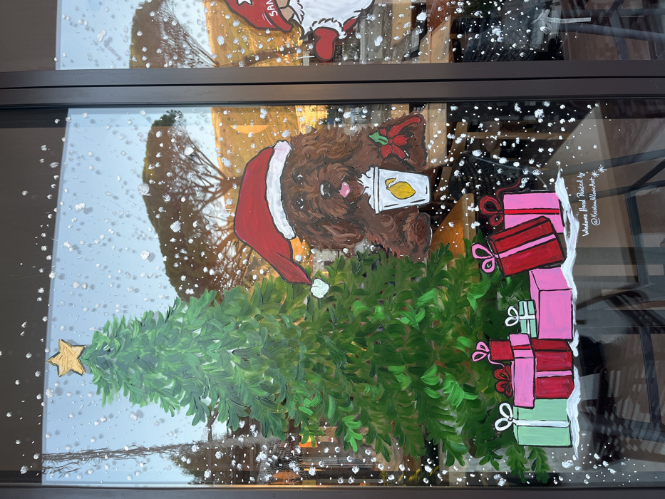 This image depicts a Christmas-themed window painting on a storefront in Tivat, Montenegro