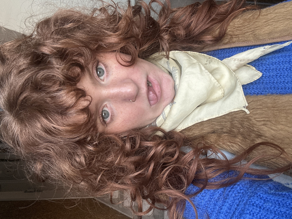 A full-frame portrait depicts an individual with reddish-brown, voluminous curly hair and light blue eyes, directly facing the camera. The person's left nostril displays a small silver nose ring. Their tongue is extended and curled, revealing a small metallic object, possibly a piercing, on its underside. The individual is wearing a royal blue knit garment, overlaid with a brown, textured, possibly faux fur vest. A cream-colored bandana with faint grey patterns is tied around their neck. The background is indistinct and blurred, appearing as a light-toned, unidentifiable indoor or sheltered outdoor setting. No specific location within the city of Suresnes, France, is discernible from the image content.