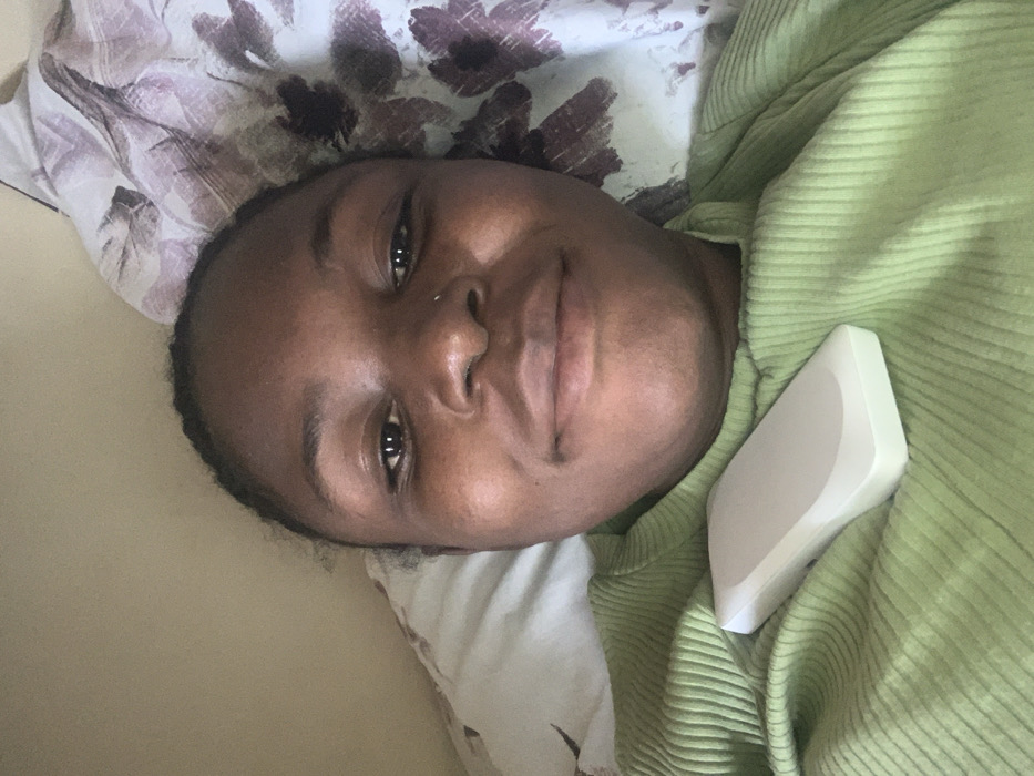 A young adult female is depicted in a close-up selfie, lying in an interior setting within the city of Tempure, Nigeria. She has dark skin, dark hair, and a small stud piercing on her right nostril, exhibiting a faint smile while looking directly into the camera. She is wearing a light green, ribbed long-sleeved top. A white, rectangular electronic device with rounded edges rests on her upper chest, partially covered by her garment. Behind her head, a light-colored pillow is visible, and to her right, a patterned pillow or blanket featuring dark floral designs against a lighter background is present. The background behind the bedding appears to be a plain, light-colored wall.