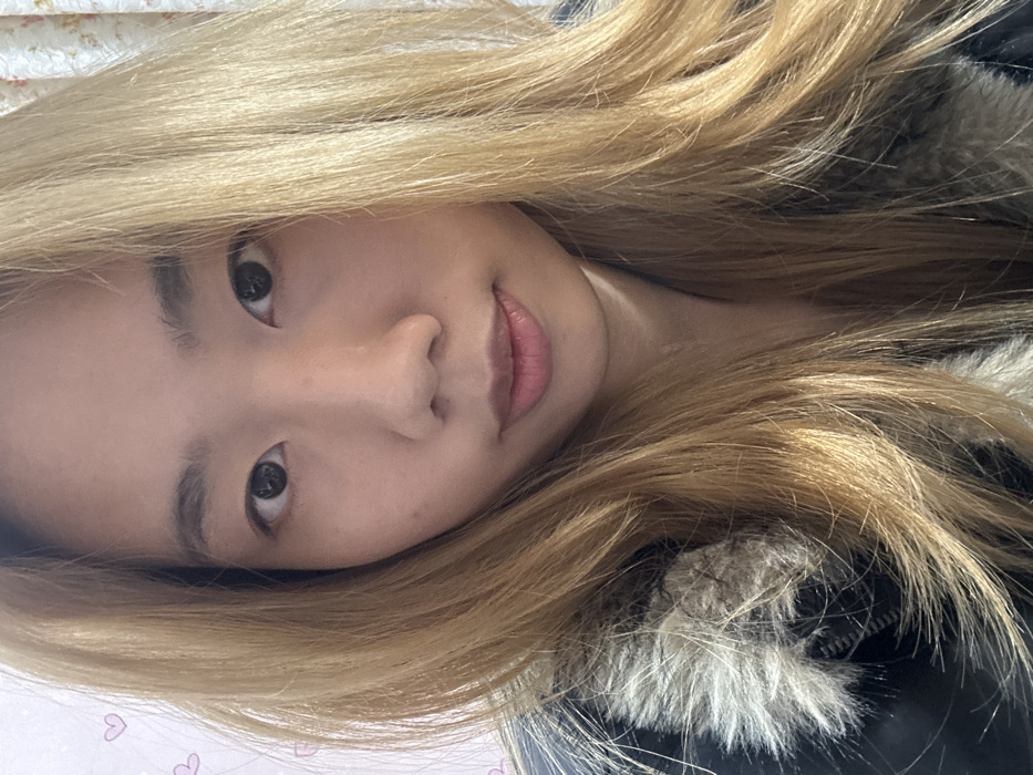 The image presents a close-up, frontal portrait of an East Asian female, situated within an indoor environment in Shapingba District, China. The subject has straight, light brown to blonde hair, parted centrally or slightly off-center, which falls around her shoulders and frames her face. Her dark eyes are open and directed straight at the viewer. Her facial features are neutral, with a closed mouth and a clear complexion. She is observed wearing a dark jacket, possibly leather, featuring a collar of light-colored, shaggy fur or faux fur in shades of grey and white. The background is softly blurred: to the viewer's left, a light-colored wall exhibits faint pink heart patterns, while to the viewer's right, a light-toned curtain with a subtle floral or intricate pattern is visible. The lighting appears even, highlighting the subject's hair and face.