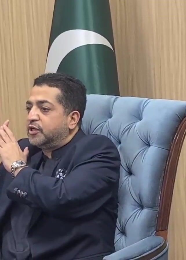Three men are seated at a table in front of a wall with wood paneling. The man in the center is speaking with his hands raised. He is wearing a dark suit and a watch. The man to his left is wearing a dark jacket and has a beard. The man to his right is wearing a blue suit and glasses. There are several microphones in front of them. Behind them are two flags, one of which appears to be the flag of Pakistan.