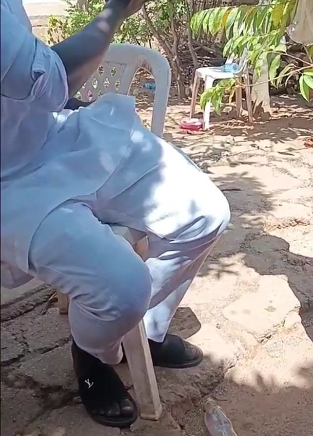 Here is a detailed description of the video: A man is sitting on a white plastic chair outdoors. He is wearing a light-colored shirt and pants, with black sandals. He holds a black bowl in his left hand. A plastic water bottle lies on the ground near his feet. In the background, there is another white chair, vegetation, and a wall. The ground is a mix of dirt, sand, and some cracked pavement. The scene is partly shaded.